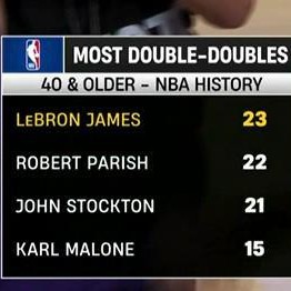 北京时间今日,在NBA常规赛中,洛杉矶湖人队在主场迎战夏洛特黄蜂队。直播期间,转播方晒出了NBA历史上球员在40岁后两双...