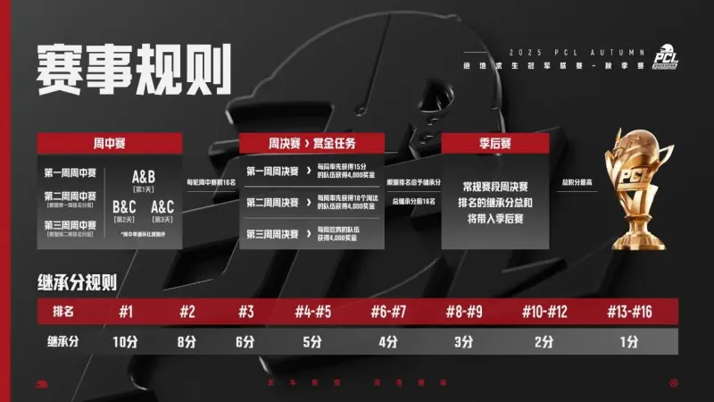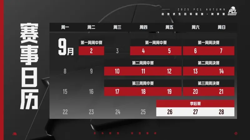 虎扑08月26日讯 PUBG赛事官方发布2025PCL秋季赛公告,比赛将于9月2日持续至9月28日,总奖金300万人民币。详细内容如下: